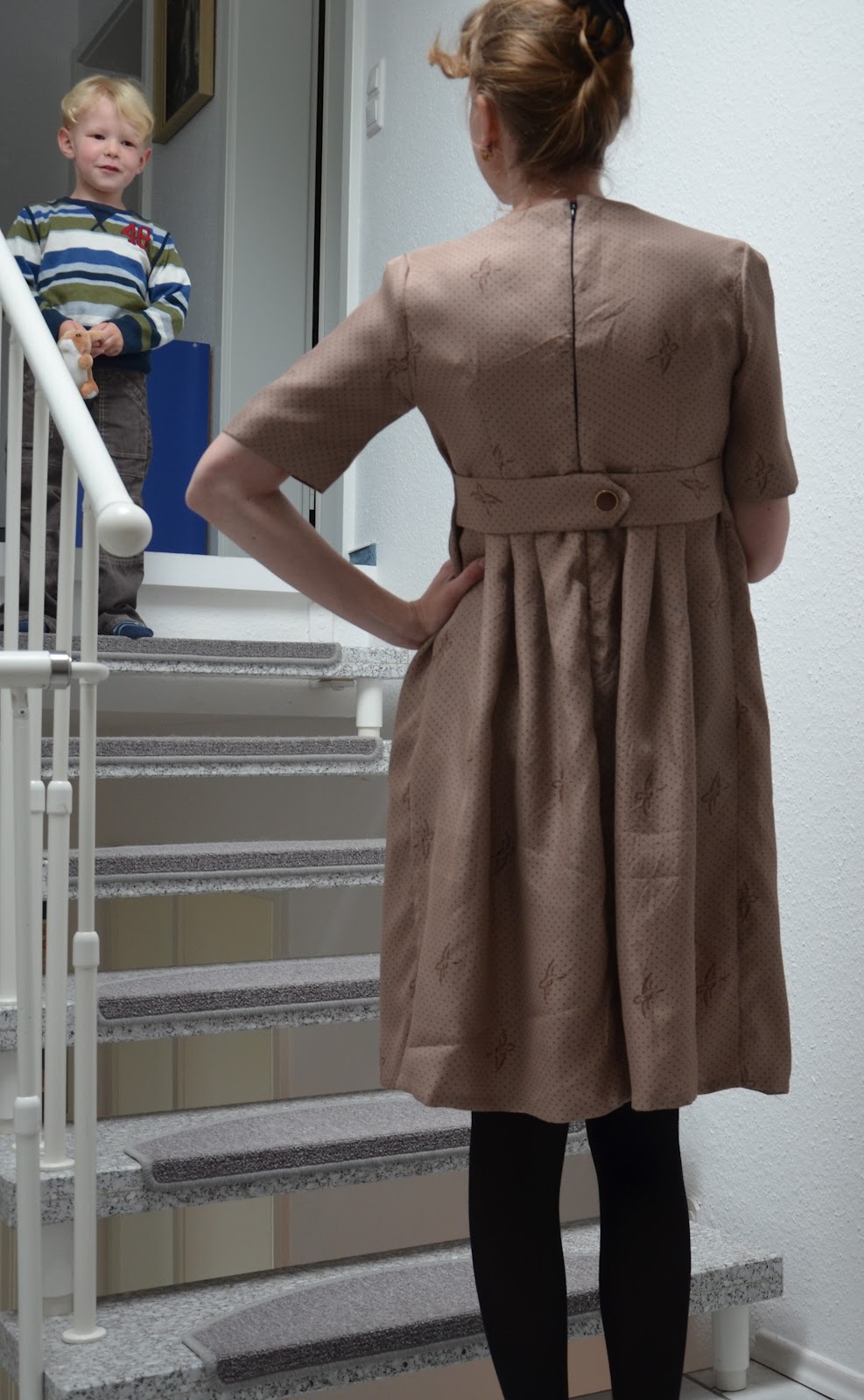 Ich habe kleine Änderungen vorgenommen. Der Reißverschluss kam auf den Rücken, dafür sind die Knöpfe nur Zierde; außerdem habe ich Taschen in die Seitennäht eingesetzt.